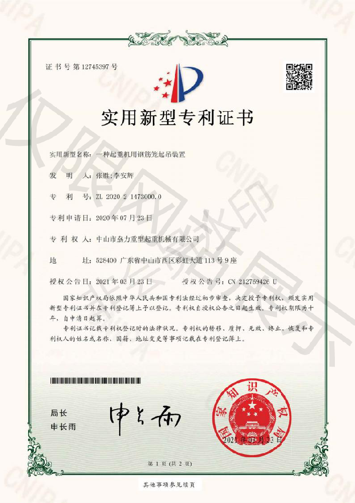 實用新型專利證書 -- 起重機用鋼筋籠起吊裝置
