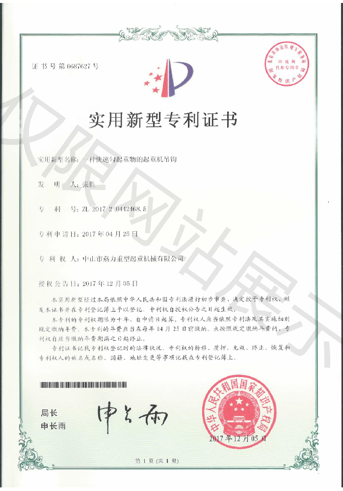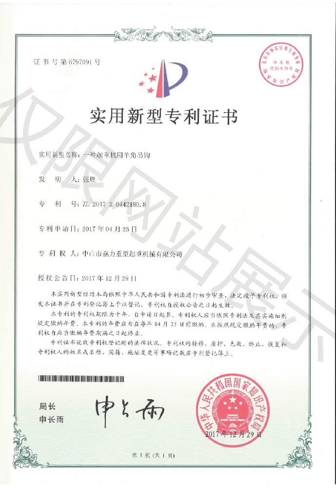 實(shí)用新型專利證書 -- 起重機(jī)用羊角吊鉤