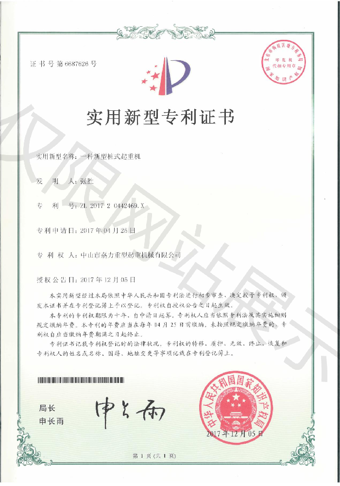 實(shí)用新型專利證書 -- 新型樁式起重機(jī)
