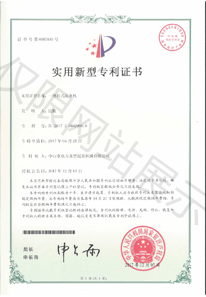 實(shí)用新型專利證書 -- 柱式起重機(jī)