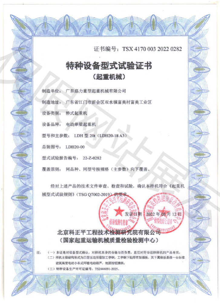 特種設(shè)備型式試驗(yàn)證書--電動(dòng)單梁起重機(jī)