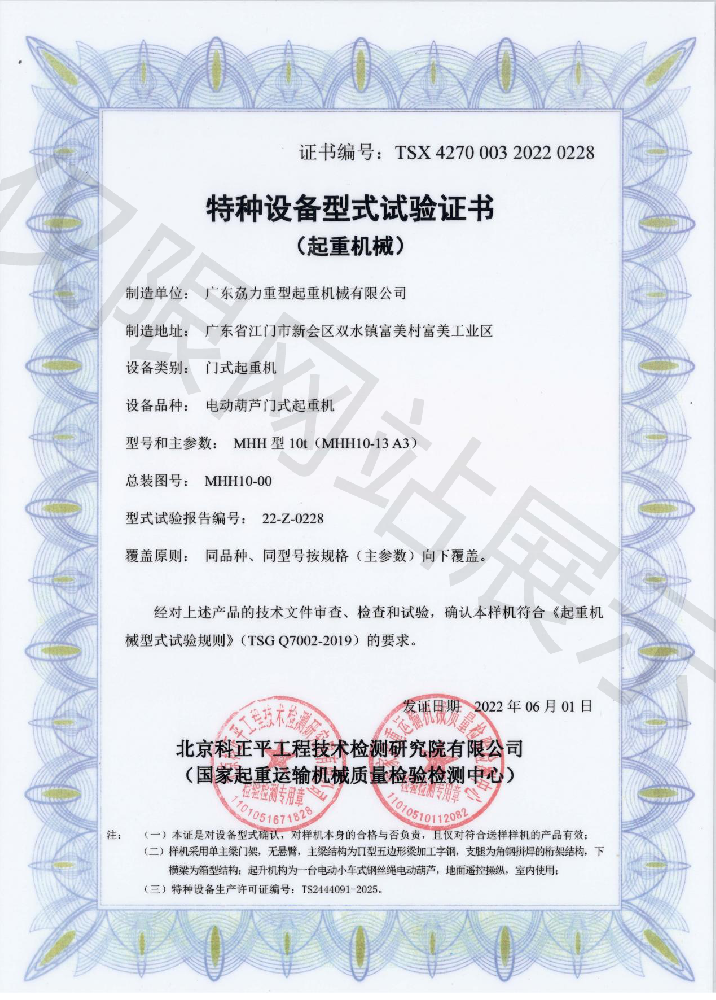 特種設(shè)備型式試驗(yàn)證書--電動(dòng)葫蘆門式起重機(jī)