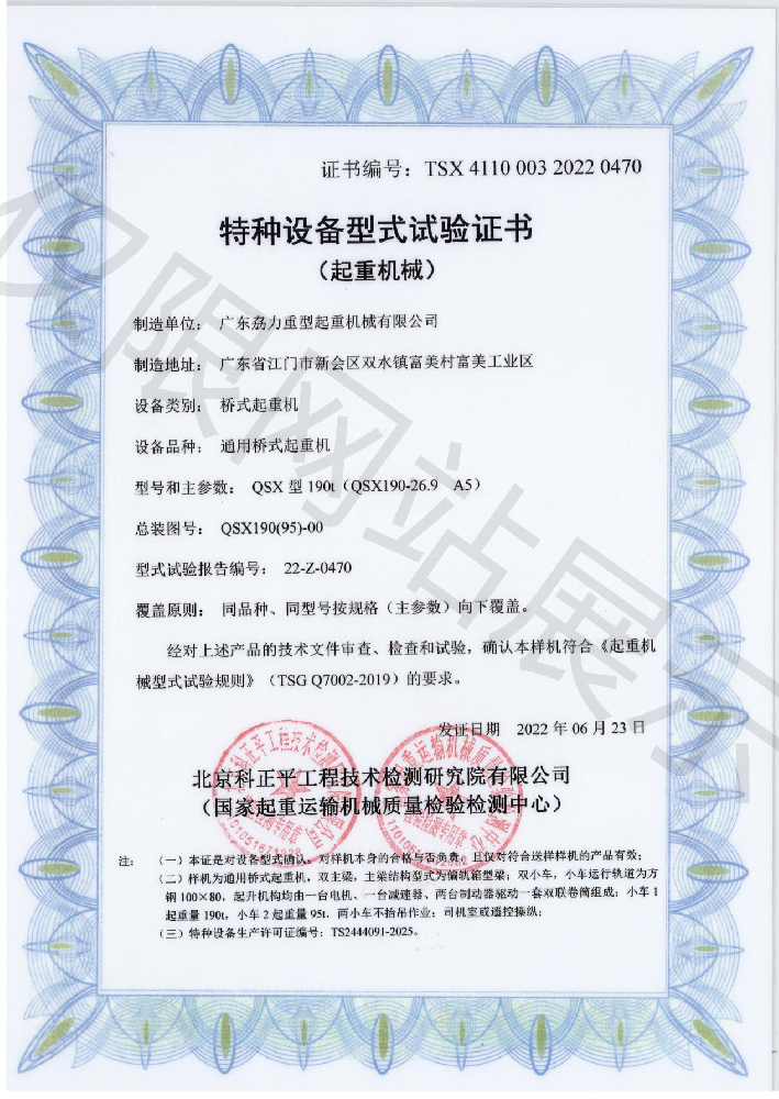 特種設(shè)備型式試驗(yàn)證書--通用橋式起重機(jī)